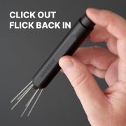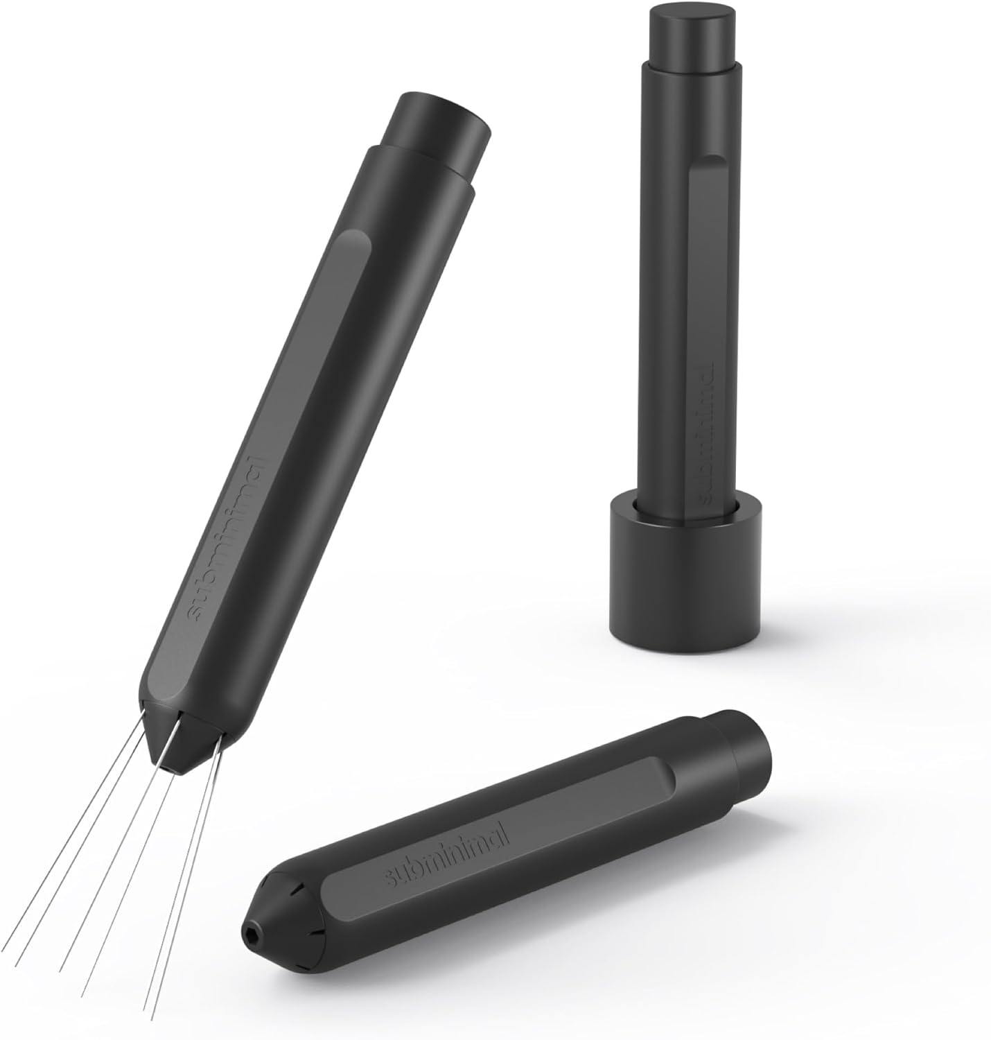 Med et enkelt klik skyder nålene ud, når du har brug for dem, og med et hurtigt håndledstryk trækkes de tilbage igen. At forberede din kaffepuck har aldrig været så enkelt og sjovt. Værktøjet kommer med forudinstallerede 0,5 mm nåle og leveres også med 0,35 mm reservnåle.
