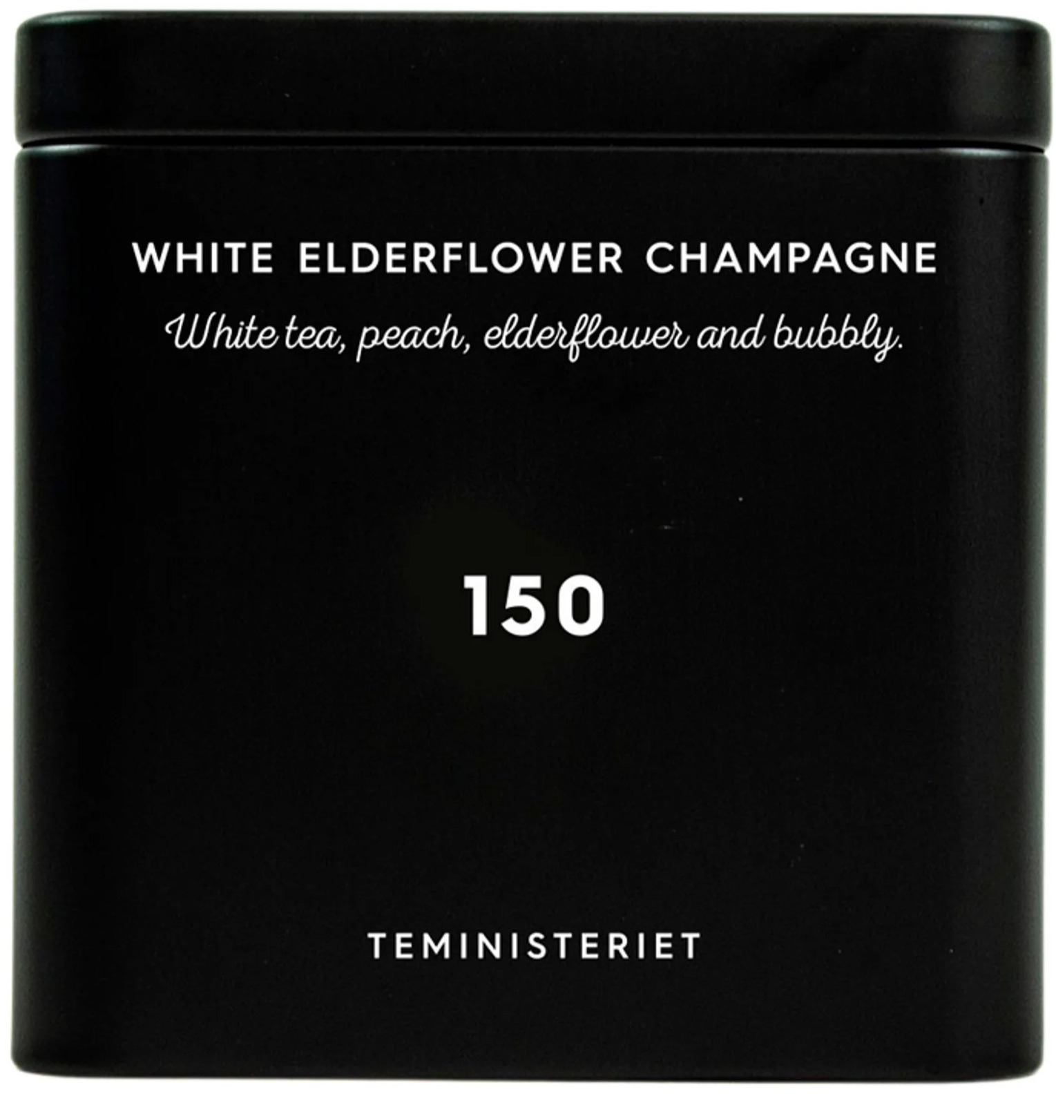 Teministeriet 150 White Elderflower Champagne er en blanding af hvid te, smagt til med sød fersken, duftende hyldeblomst og champagne. Subtile blomster- og frugtnuancer giver en mild og opløftende teoplevelse.