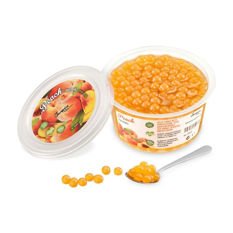 Bubble Tea Peach-frugtperlerne smager godt i bubblete (Boba eller Bubble Tea), frugtdrikke, cocktails og også i desserter. The Inspire Food Companys frugtperler indeholder ægte frugtsaft.