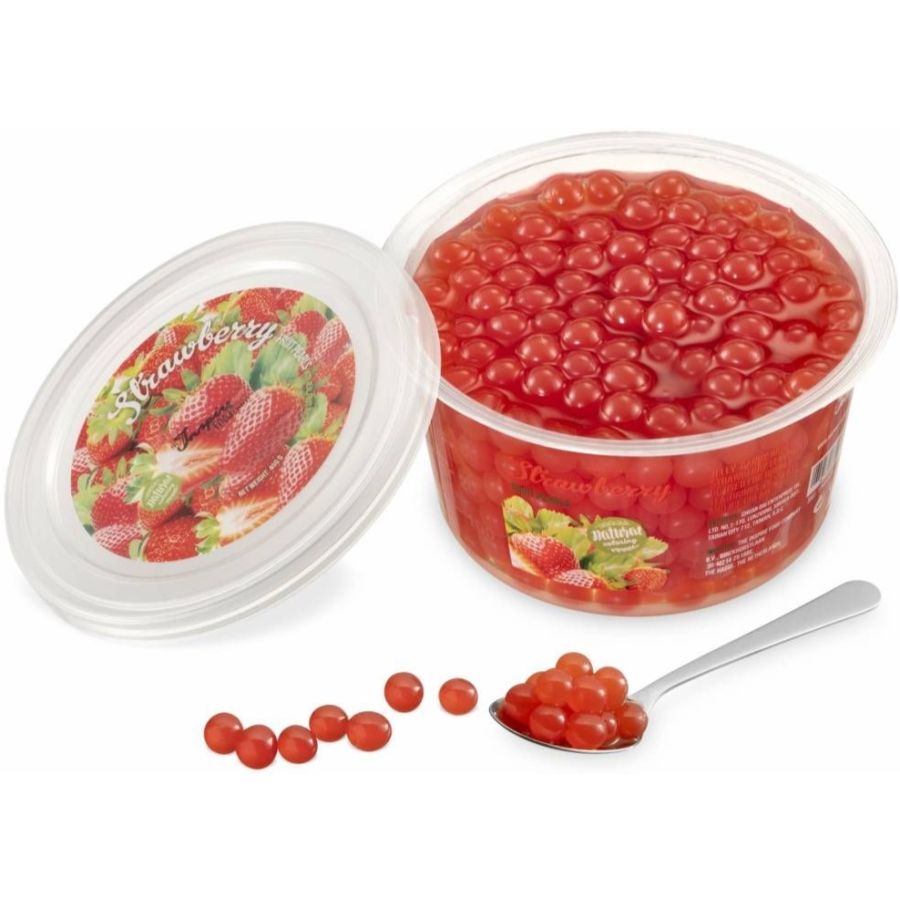 Bubble Tea Jordbær-frugtperler smager fantastisk i boblete (Boba eller Bubble Tea), frugtdrikke, cocktails og endda i desserter. The Inspire Food Company's frugtperler indeholder ægte frugtsaft.