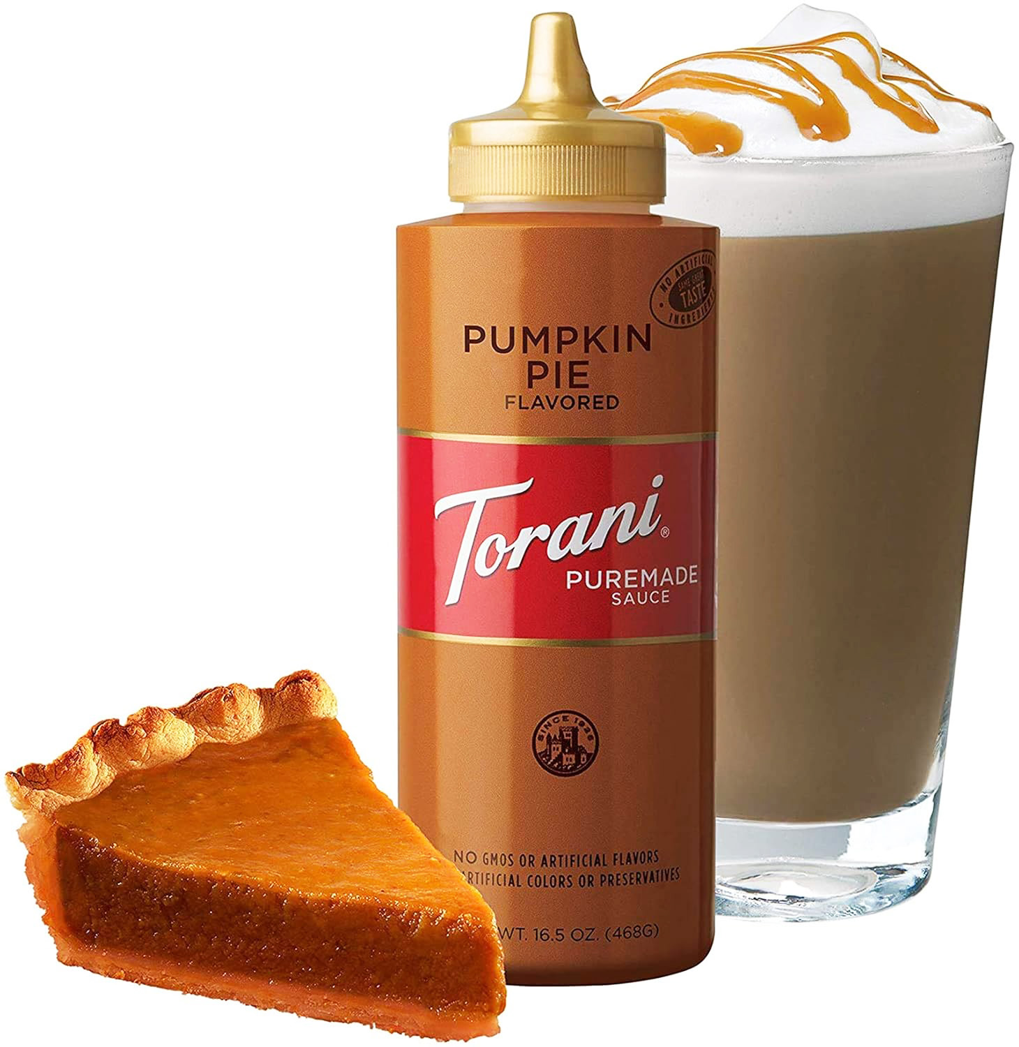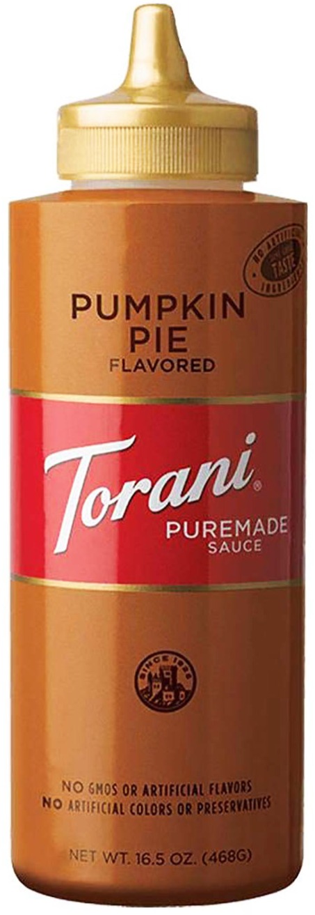Torani Puremade Pumpkin Pie -sauce med smag af pumpkin spice-krydderier såsom kanel, muskatnød og andre sæsonbetonede krydderier. Pumpkin Pie -saucen indeholder ingen kunstige konserveringsmidler eller GMO-ingredienser.