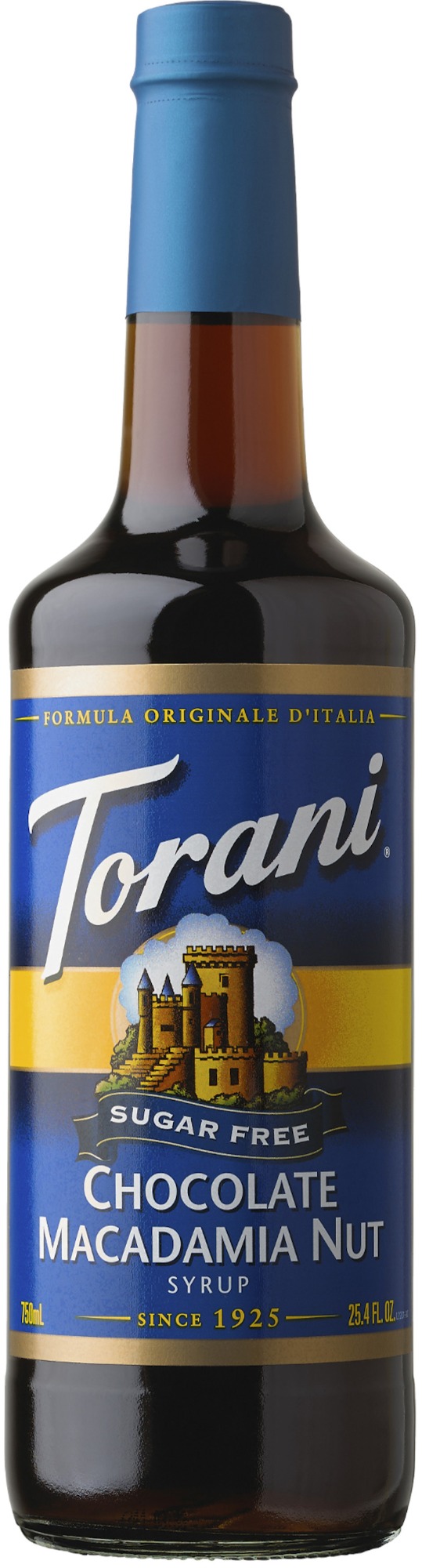 Sukkerfri Torani Sugar Free Chocolate Macadamia Nut -siruppen kombinerer dekadent chokolade med den milde, næsten smøragtige macadamianød, helt uden kalorier.