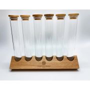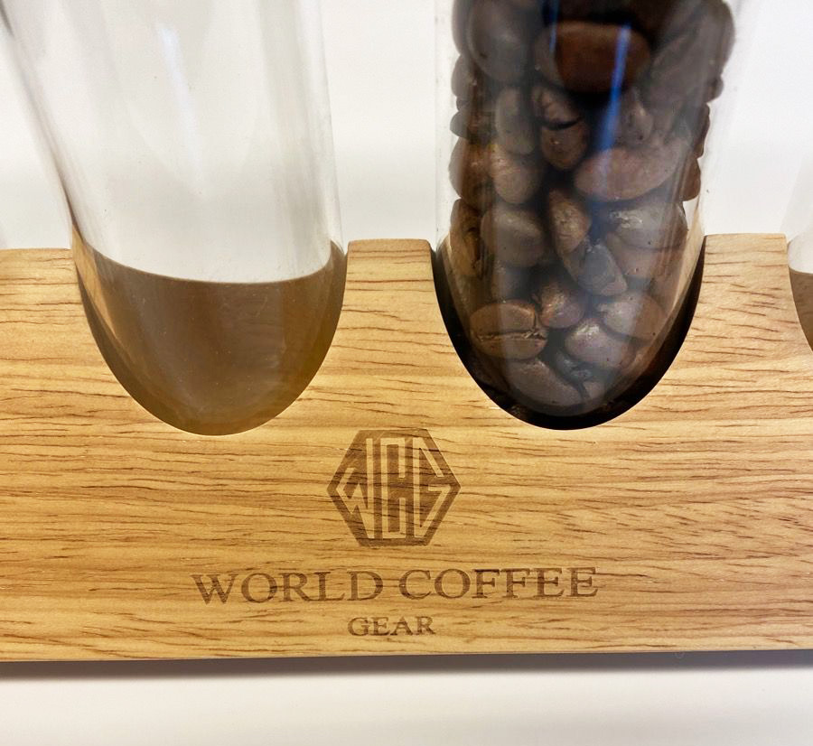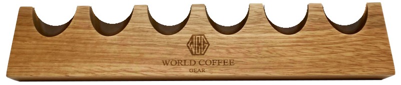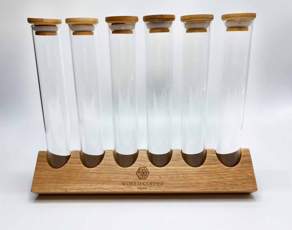 Tube Holder-stativet fra World Coffee Gear er fremstillet af egetræ og har plads til 6 WCG-kafferør i glas.