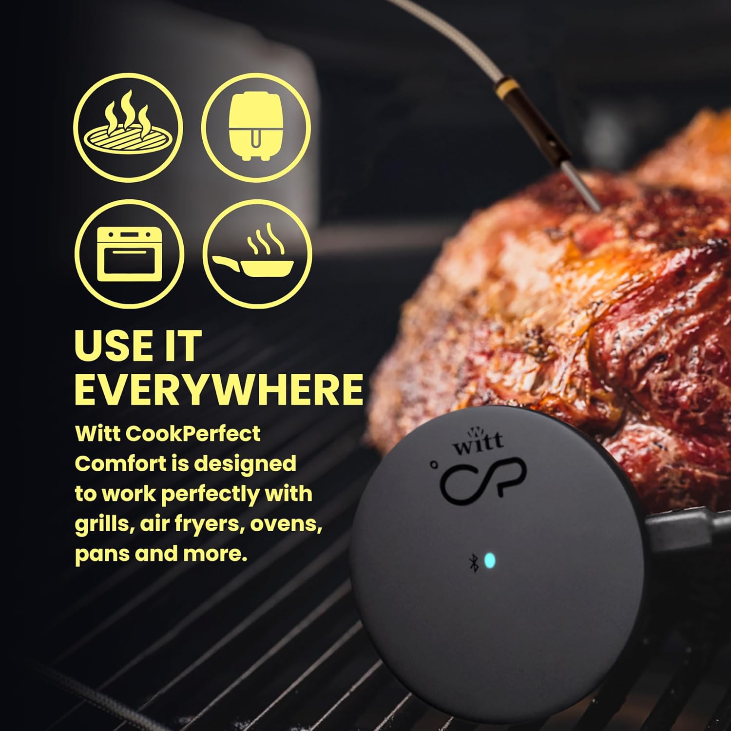 Opnå perfekte tilberedningsresultater med Witt CookPerfect Comfort Single termometer. Tilslut via Bluetooth til din telefon for opdateringer om temperaturen i realtid og færdighedsnotifikationer, selv fra 120 meters afstand.