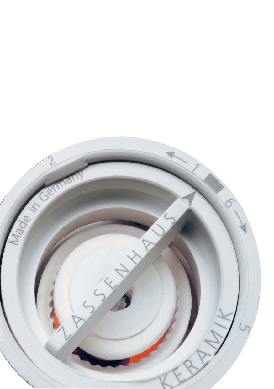 Zassenhaus -kværne er produceret i Tyskland, og kværnen tilbyder en trinløs justering af malingsgraden. Malværket er keramisk og dermed garanteret rustfrit. Det keramiske malværk kan også male hårdere materialer sammenlignet med stål, og udover salt og peber kan du også male tørrede krydderier og urter.