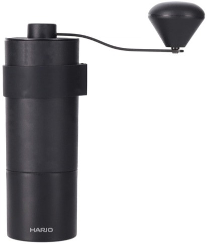 The Hario Mini Black PRO coffee grinder features a minimalist design with a lightweight plastic body, weighing just 312 grams, making it an excellent portable solution.