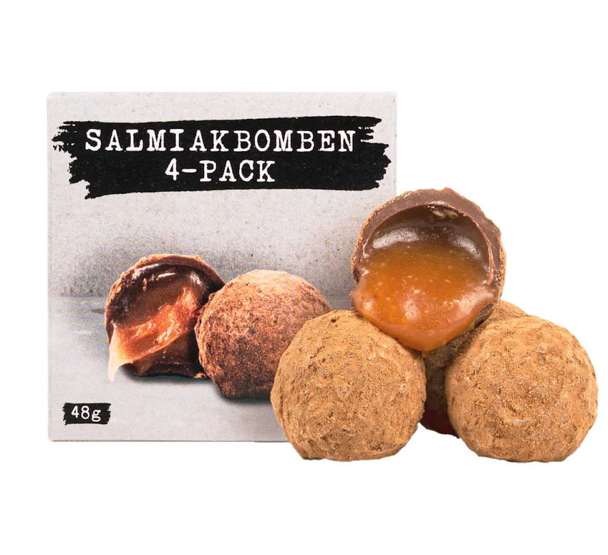 The Salmiak Bomb from Haupt Lakrits is a chocolate praline filled with delicious caramel cream, surrounded by salty licorice and a coating of milk chocolate. The combination of sweet chocolate, caramel cream, and salty licorice creates a balanced taste explosion for those who desire more than just "a little licorice.