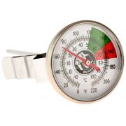 The easy-to-read dial on the Rhinowares milk thermometer allows for quick and accurate measure of textured milk and other beverages. The thermometer is 13 cm long. Temperature is shown within the range of -18 to 104 degrees Celsius, and it has a marked range for recommended milk temperature. The thermometer is also equipped with a stainless steel clip with adjustable height, allowing the thermometer to sit perfectly in a milk pitcher.