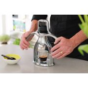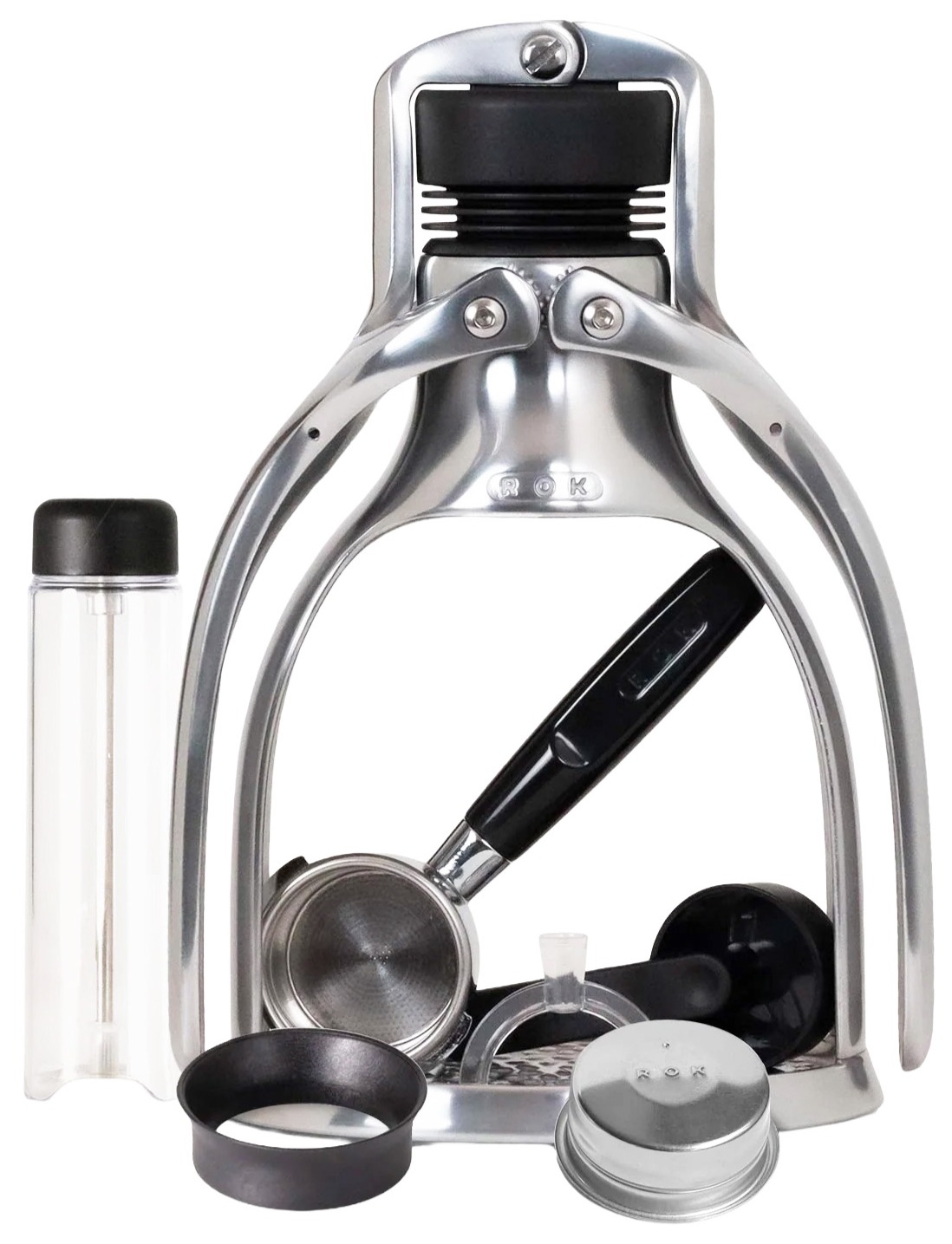 The ROK EspressoGC PLUS manual espresso maker is crafted from cast aluminium, steel and glass-composite.